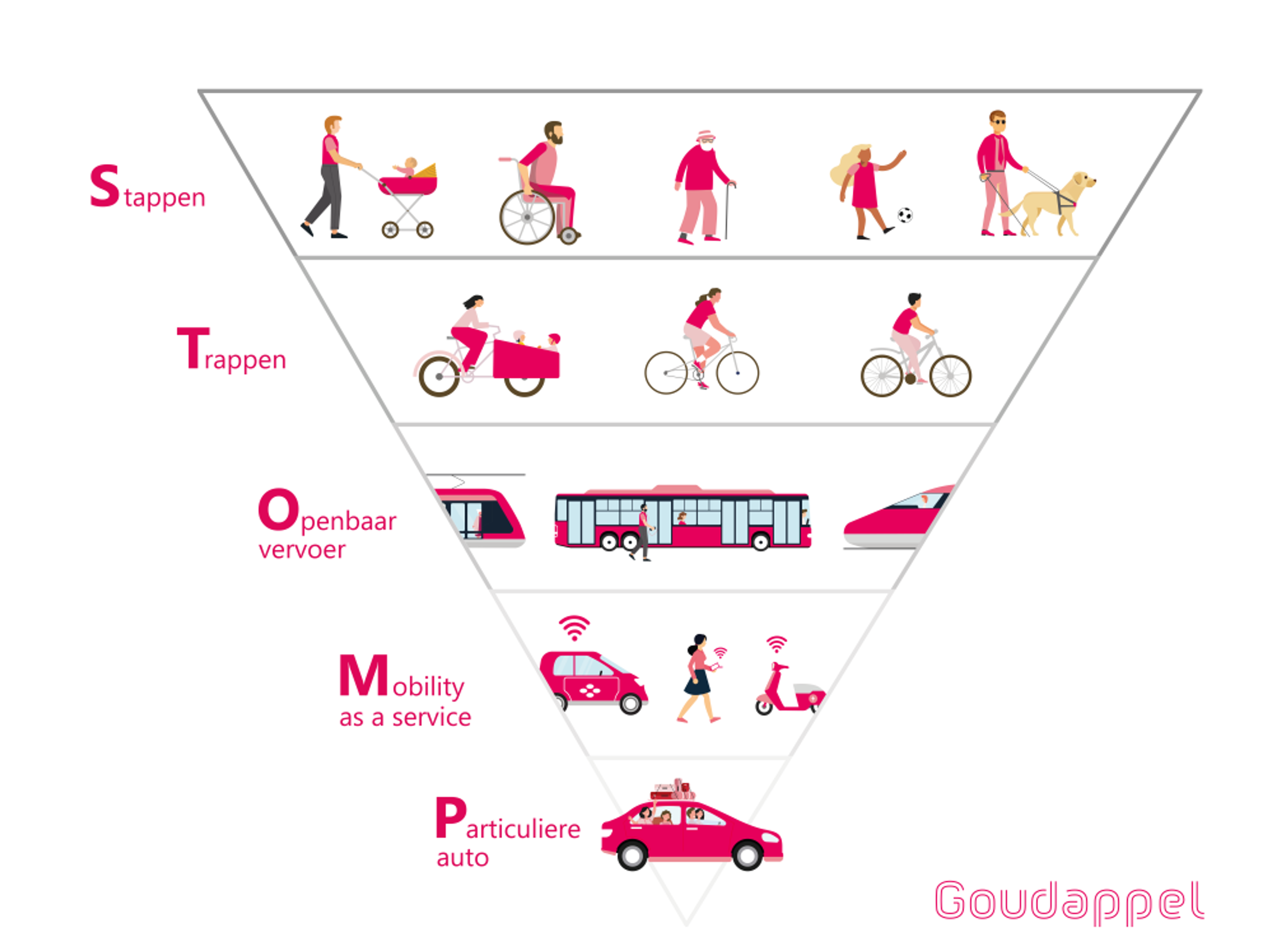 There are several strategies and tools for making mobility more sustainable. One of the most effective is the STOMP ordering principle, developed in the 1980s and 1990s by Dr. Jan Korsmit. STOMP stands for Steps, Steps, Public Transportation, MaaS (Mobility as a Service) and Private Car. This model encourages a hierarchical approach that prioritizes the most sustainable modes of transportation and sets up infrastructure to make sustainable choices more attractive.