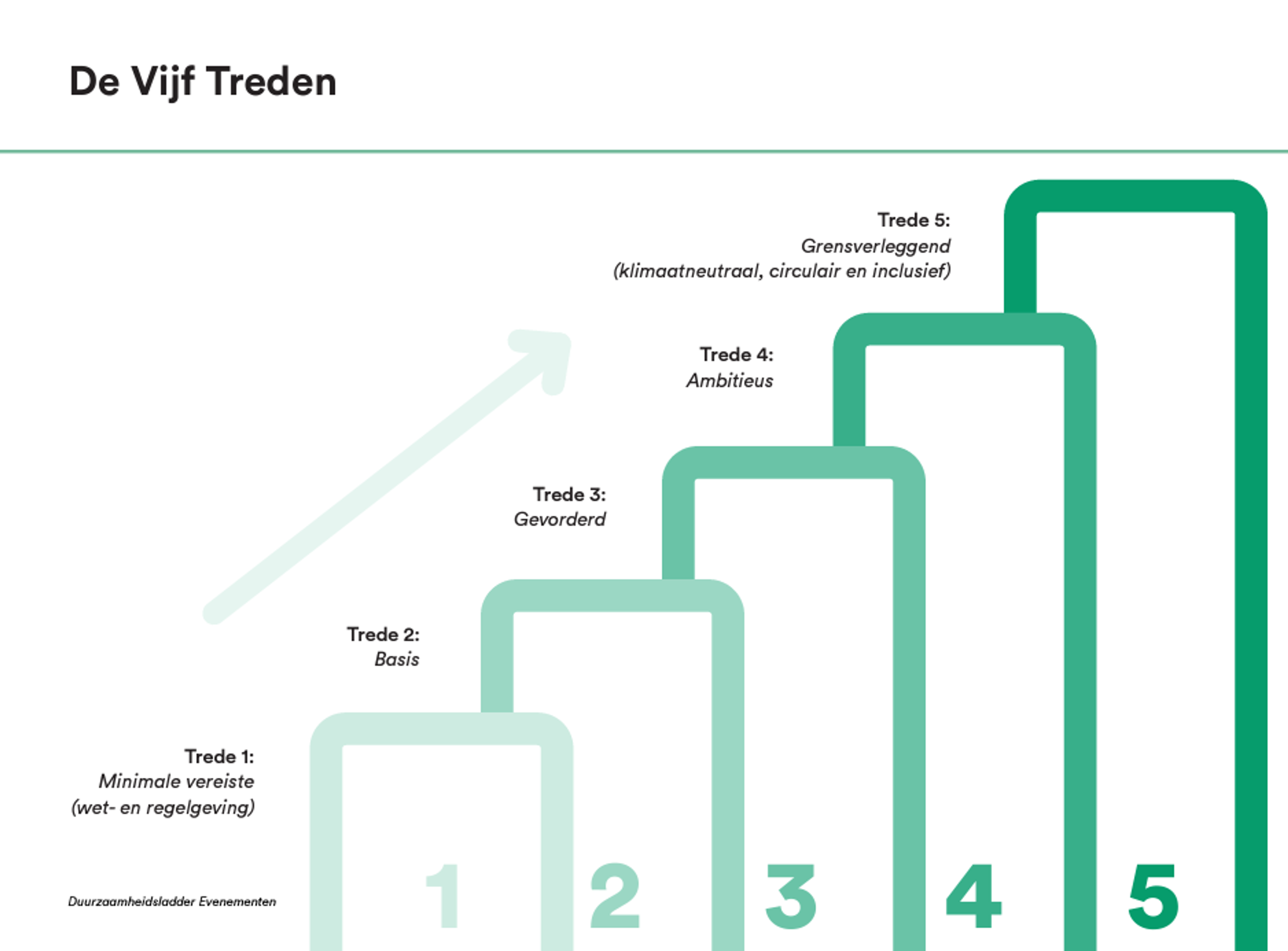 The Sustainability Ladder Events (DLE), developed by Green Events Netherlands and several partners, provides a practical method for making events more sustainable and inclusive. It helps organizations understand their current position and step-by-step achieve more sustainable ambitions through five steps, from minimum legal requirements to fully circular and inclusive working. A clear roadmap for organizations to integrate sustainability within different themes: